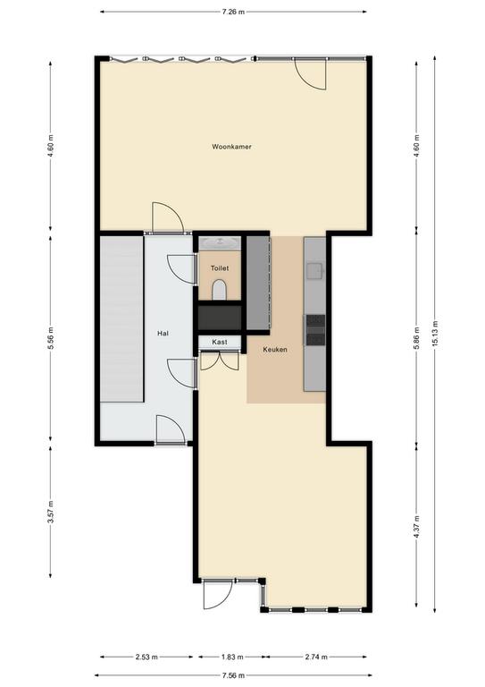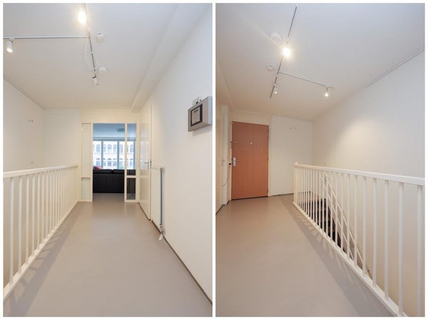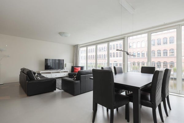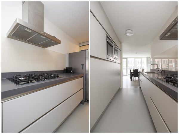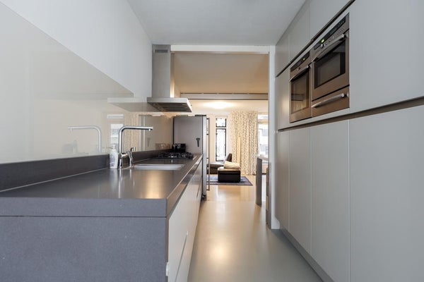 Entrée, couloir avec accès au salon et à la cuisine. Le salon avec cuisine ouverte bénéficie de beaucoup de lumière naturelle et d'une belle vue sur l'Uilenburgergracht grâce à la grande surface de fenêtres sur toute la largeur.