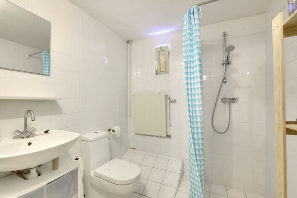 Palier avec rangement et salle de bain avec douche et toilettes. Studio avec salon, coin nuit et cuisine ouverte. Ce studio est situé sous le toit avec les fermes visibles, ce qui crée une atmosphère conviviale.