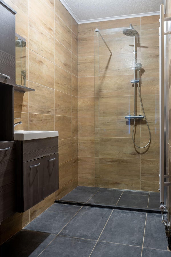 - Salle de bain soignée, douche avec douche à effet pluie et douche à main.