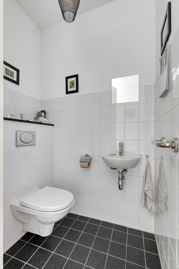 Les toilettes sont partiellement carrelées et sont équipées d'un WC suspendu et d'un lavabo.