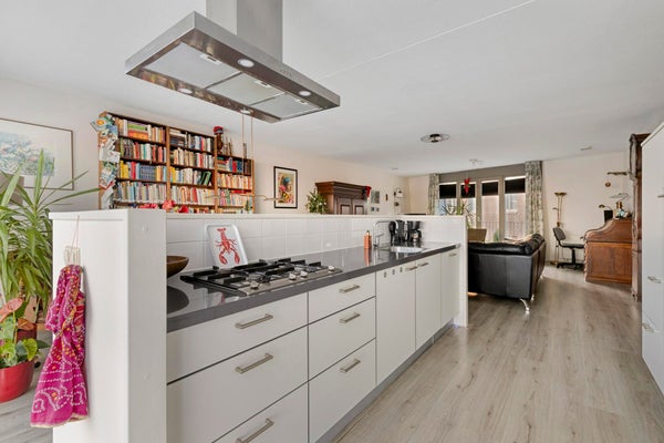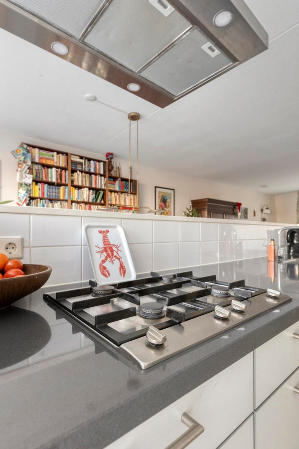 De l'autre côté, il y a également divers placards, un lave-vaisselle, une plaque de cuisson (gaz), une hotte aspirante et un évier avec robinet mélangeur.