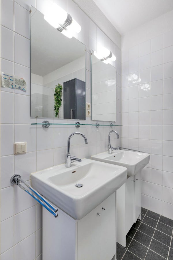 La salle de bains est spacieuse et est équipée d'une baignoire, d'une douche, de toilettes et d'un double lavabo. La salle de bains est presque entièrement carrelée et fait environ 8 m2.