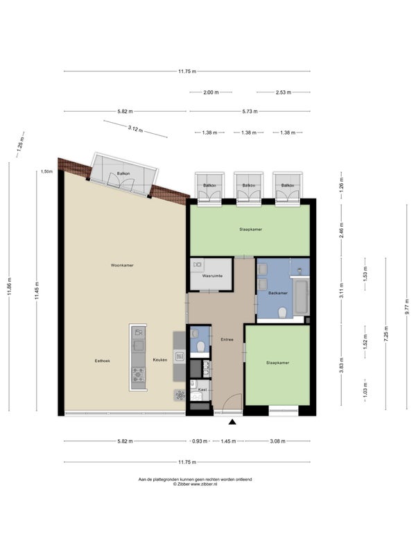 Une entrée spacieuse donne accès à presque toutes les pièces de l'appartement : le compteur, la salle des chaudières, la chambre 1, la chambre 2, la salle de bains, les toilettes, le lave-linge et le salon avec cuisine ouverte.