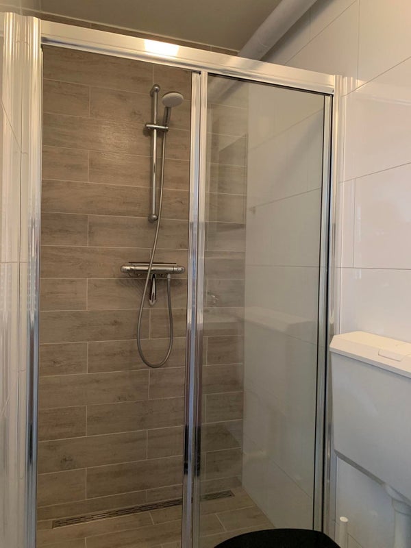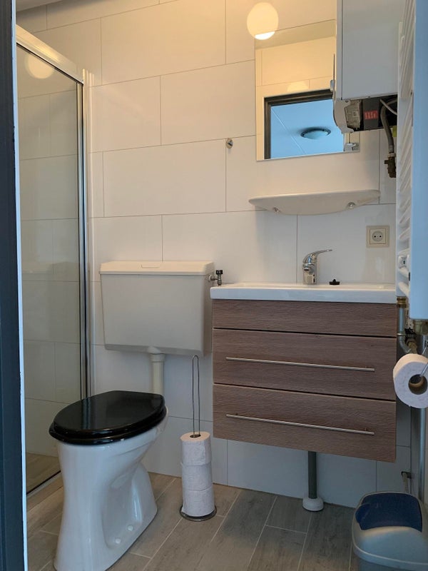 Salle de bain avec douche, toilettes et lavabo. Chaudière individuelle pour l'eau chaude.