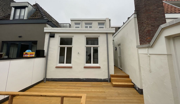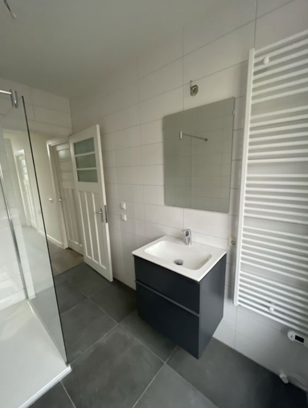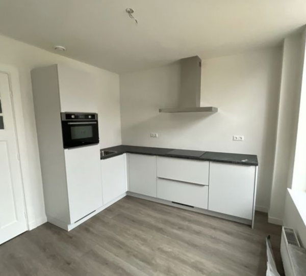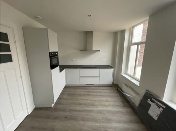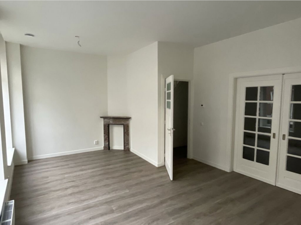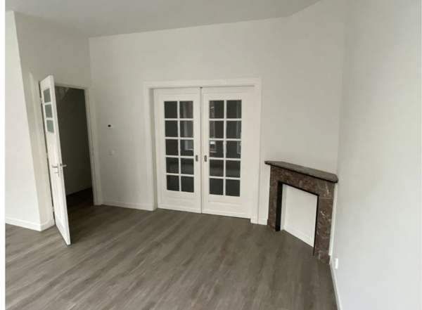 Entrée dans un hall d'accueil spacieux qui donne accès à un cabinet de toilettes, une cuisine de vie, un débarras et un séjour. Accès à l'étage par l'escalier où se trouvent deux chambres, une salle de bain et une terrasse sur le toit. L'ensemble de l'appartement est doté d'un élégant parquet en PVC en chevron. Les hauts plafonds apportent une agréable sensation d'espace dans tout l'appartement. La salle de bain et le cabinet de toilettes sont équipés de sanitaires de haute qualité. Dans la salle de bain se trouvent, entre autres, une douche à l'italienne, un lavabo et un WC. Le débarras est équipé d'un raccordement de chauffage central. Le salon bénéficie d'une belle luminosité et comprend des éléments caractéristiques d'origine tels que les cheminées originales. La cuisine est dotée de toutes les commodités, y compris une plaque de cuisson à induction, une hotte, un four combiné/micro-ondes, un lave-vaisselle et une cuisine.