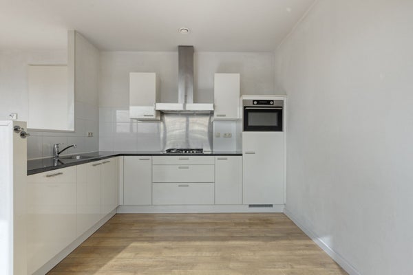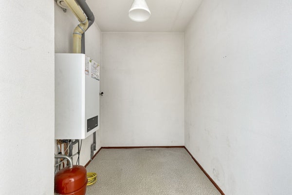 Vous entrez dans l'entrée/couloir avec un placard à compteur et des toilettes avec un WC suspendu. Le salon spacieux reçoit beaucoup de lumière. La cuisine moderne est équipée d'un aménagement blanc laqué avec un plan en granit, un lave-vaisselle, un réfrigérateur, une hotte aspirante et une plaque de cuisson. L'appartement dispose de deux chambres et d'une salle de bain entièrement carrelée avec baignoire, douche et lavabo. De plus, il y a un débarras intérieur avec chaudière et raccordement pour machine à laver.