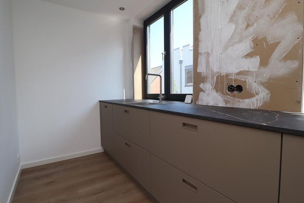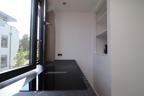 La cuisine luxueuse est équipée d'un lave-vaisselle, d'une plaque de cuisson à induction avec extraction intégrée et d'un four. De la cuisine, il y a une belle vue sur la rue accueillante.