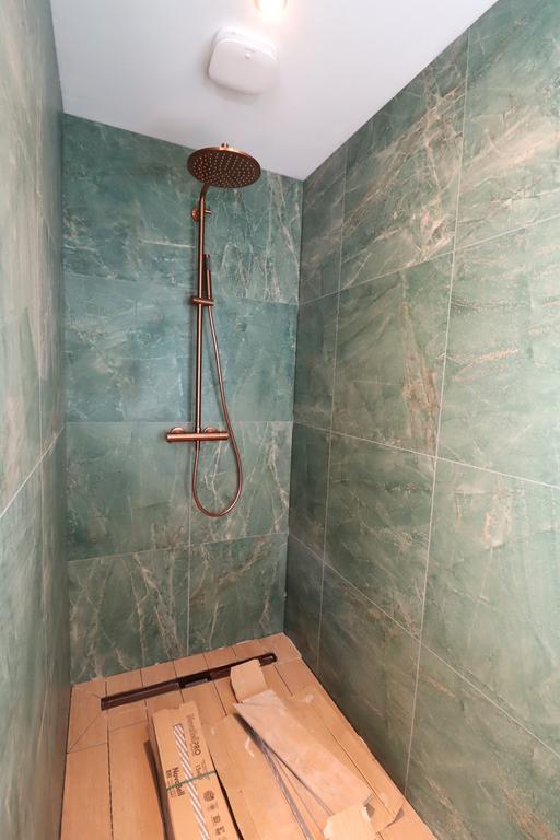 La cuisine est actuellement carrelée avec les mêmes carreaux chics que dans les toilettes et la salle de bain.