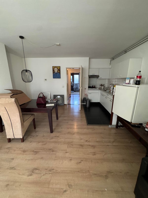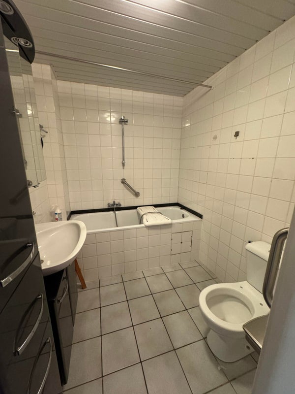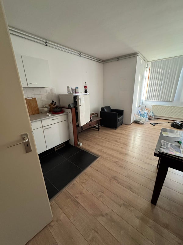 Hall avec tableau électrique, salon (doté d'un sol en stratifié moderne) avec cuisine ouverte, 1 chambre donnant accès à la terrasse, salle de bains avec baignoire, lavabo, toilettes, local de chauffage central avec branchement pour machine à laver