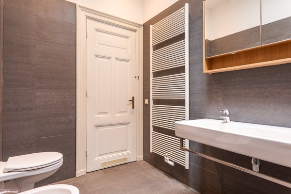 De cet étage, vous avez accès à un grand balcon orienté sud-ouest. La très luxueuse et moderne salle de bain est équipée d'une douche à effet pluie double, de deux lavabos, d'un second WC et d'un bidet. Cet étage est également terminé avec le même élégant parquet en chêne danois, créant un aspect calme et élégant dans toute la maison.