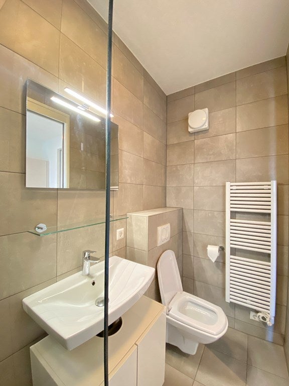 La salle de bain entièrement carrelée est équipée d'une douche à l'italienne, d'un WC et d'un lavabo avec miroir.