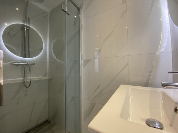 La salle de bains est équipée d'une magnifique douche à pluie, d'un lavabo avec tiroirs, d'un miroir avec éclairage et d'un radiateur à serviettes.