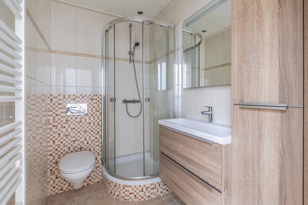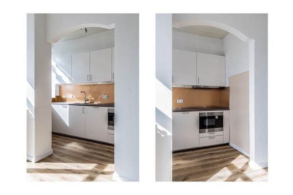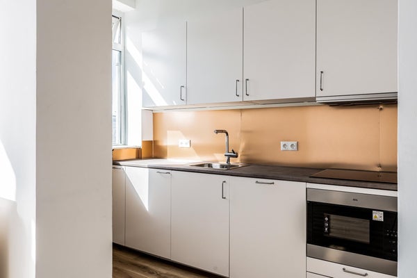 La cuisine ouverte (3,10 x 1,80) est lumineuse et moderne. Il y a beaucoup d'espace de rangement et de travail, avec un réfrigérateur spacieux et une plaque à induction avec hotte. Un lave-vaisselle est inclus. Un revêtement de sol en stratifié (2023) est posé dans le salon, le palier, la cuisine et les chambres.