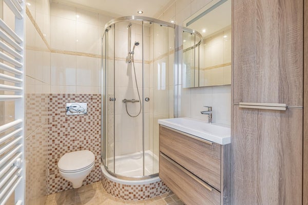 La salle de bain attenante (3,23x1,51) est jolie et moderne, avec des carreaux élégants, un lavabo et une cabine de douche de belle taille.