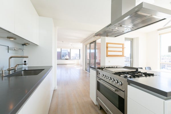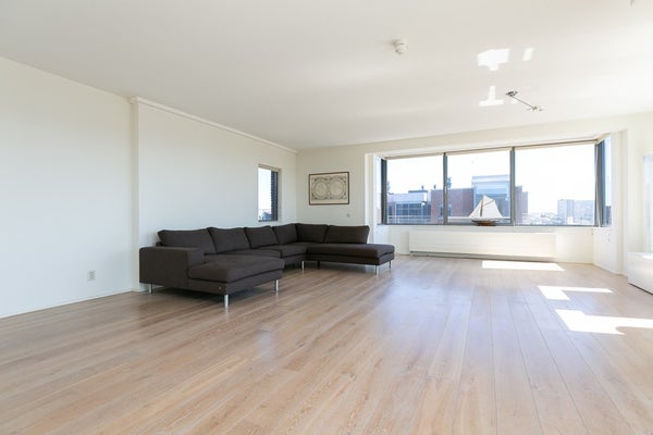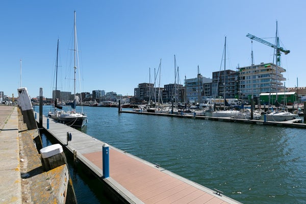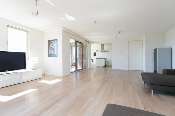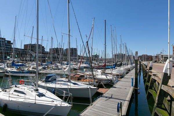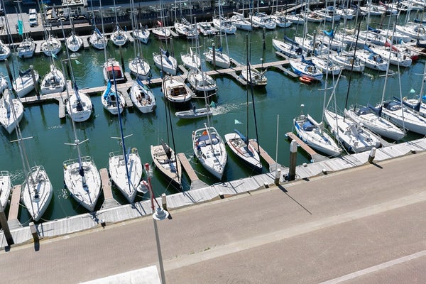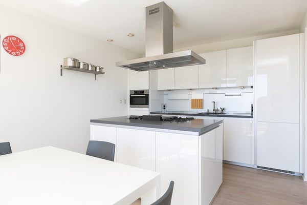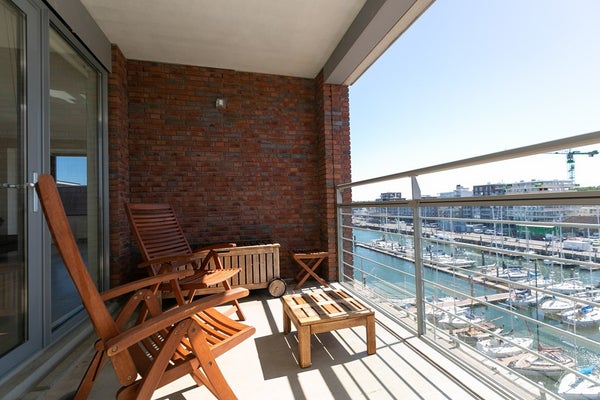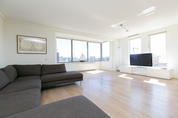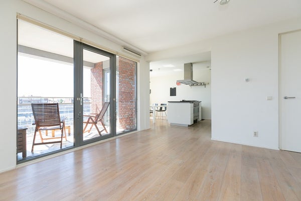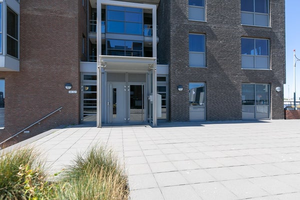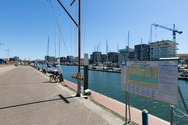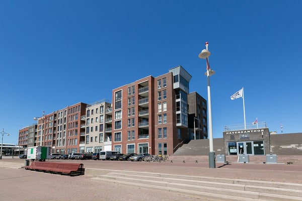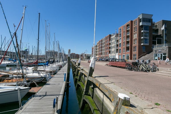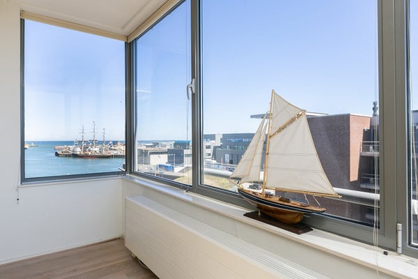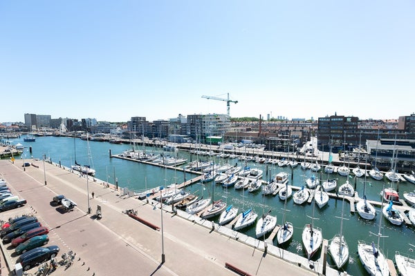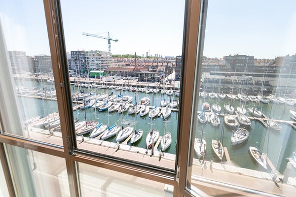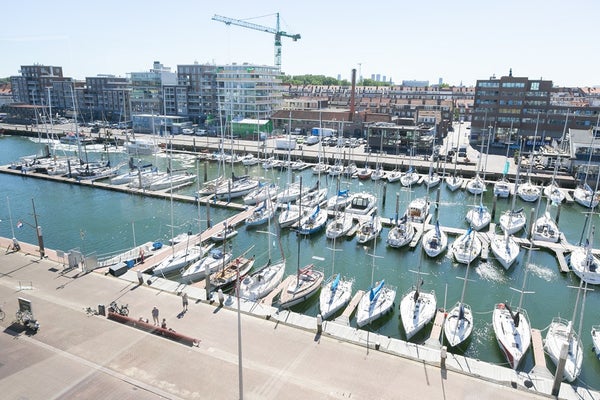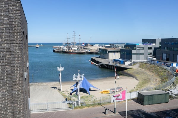 Le salon et la salle à manger ouverts, lumineux et spacieux offrent des vues attrayantes sur le port de Scheveningen. De grandes fenêtres laissent entrer beaucoup de lumière naturelle et donnent sur un balcon, idéal pour se détendre après le travail ou profiter du paysage portuaire.