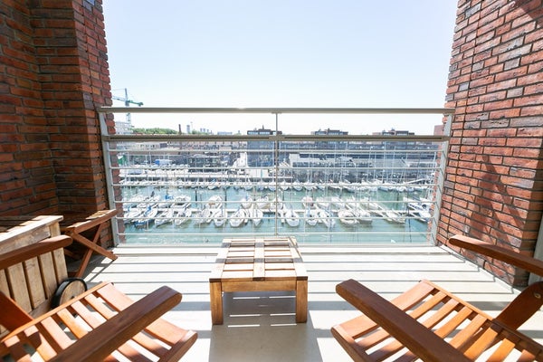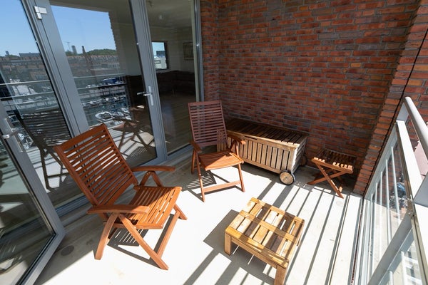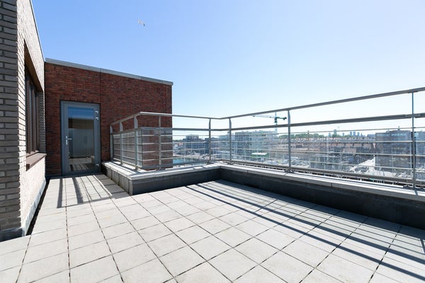L'appartement comprend deux chambres, toutes deux avec accès direct à la terrasse sur le toit privée. La chambre principale offre une vue sur le port et un espace généreux, tandis que la seconde chambre est bien adaptée en tant que chambre d'amis ou bureau à domicile.