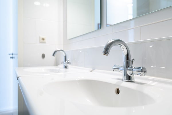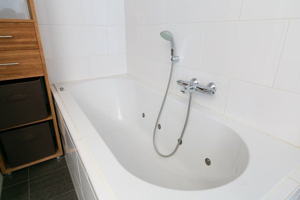La salle de bain est entièrement équipée avec un double lavabo, une douche et une baignoire. Un WC séparé est également présent.