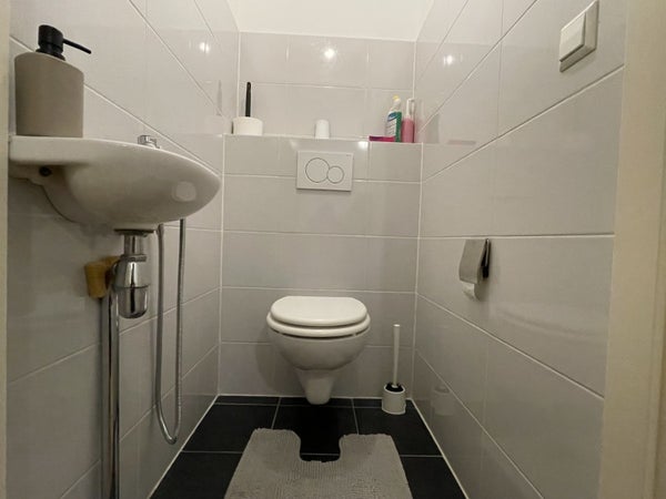 Les toilettes se trouvent séparément dans le couloir. La salle de bain est spacieuse et équipée d'une cabine de douche, d'une baignoire et d'un lavabo. De plus, le logement dispose à la fois d'un espace de rangement intérieur et extérieur, ce qui offre un plus de commodité.