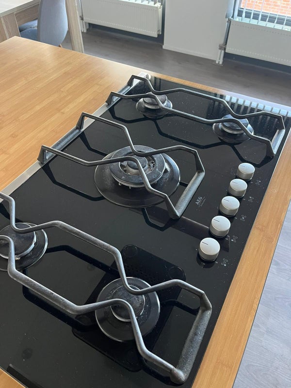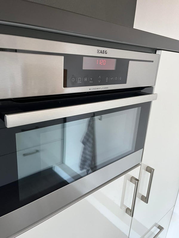 - Lave-vaisselle intégré, four, micro-ondes, réfrigérateur, congélateur, cuisinière à gaz à 5 foyers (marque : AEG)