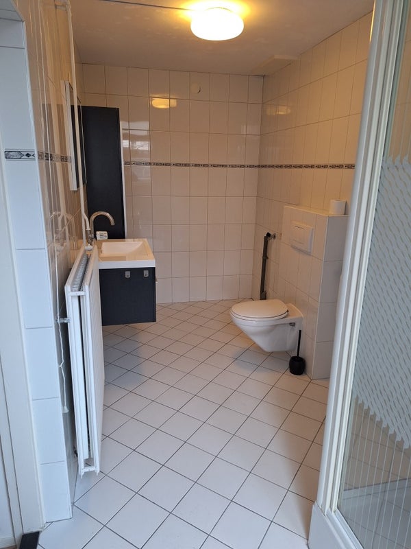 La salle de bain est entièrement carrelée et équipée d'une douche, d'un lavabo et d'un WC. Les raccordements pour les appareils de lavage sont disponibles.