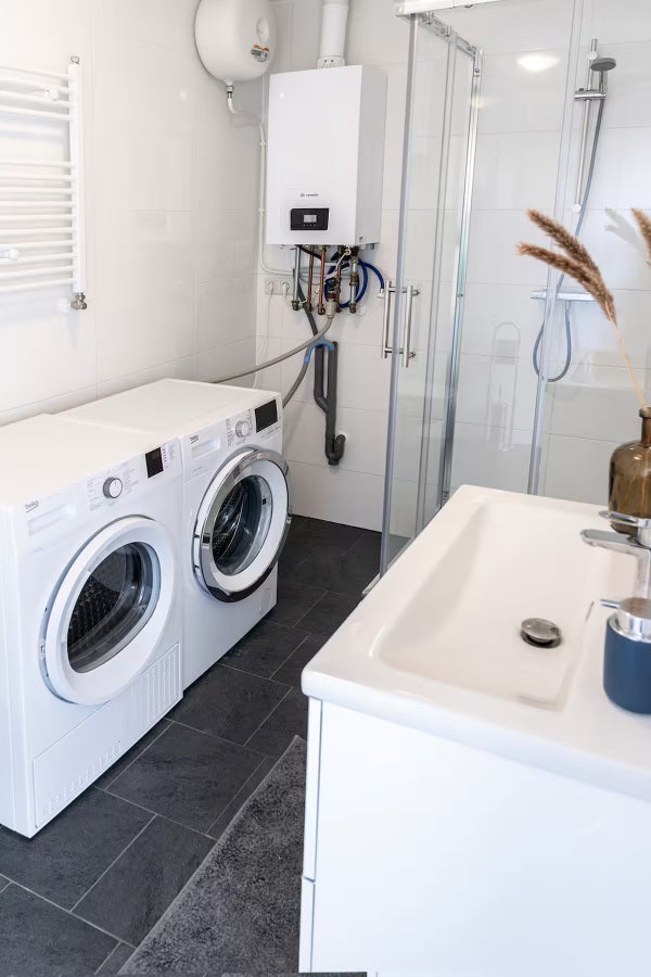 Espace de vie lumineux avec cuisine moderne. Équipé de plaques de cuisson, four/micro-ondes, réfrigérateur et tous les ustensiles de cuisine nécessaires.