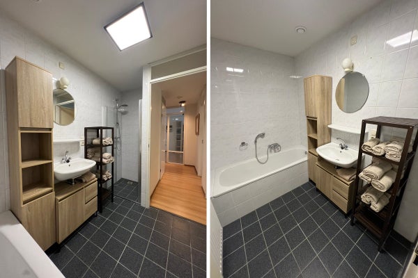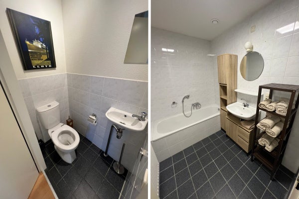 De plus, il y a deux chambres, dont une vaste chambre principale et une deuxième chambre. La salle de bain est équipée d'une douche et de lavabos fixes. En outre, il y a un toilettes séparés et un vestiaire à l'entrée.