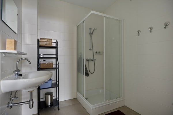 Salle de bain moderne entièrement carrelée, équipée d'une cabine de douche, d'un lavabo et d'une ventilation.