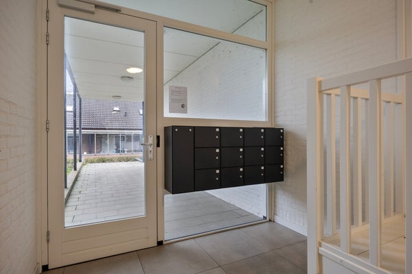 Entrée centrale représentative avec interphone, boîtes aux lettres et accès à l'escalier. L'appartement lui-même est situé au rez-de-chaussée du complexe.