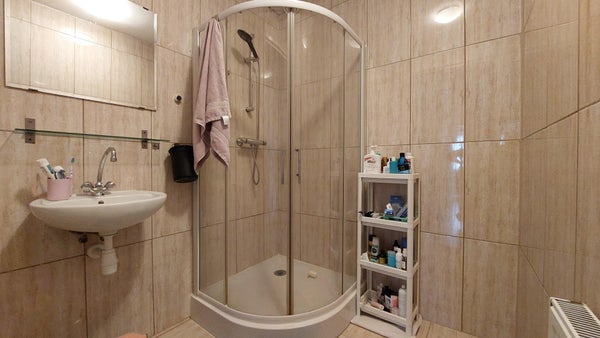 La salle de bain est dotée d'un lavabo et d'une douche propre. De plus, vous trouverez dans le couloir un toilette séparé et un espace de rangement avec une connexion pour machine à laver.