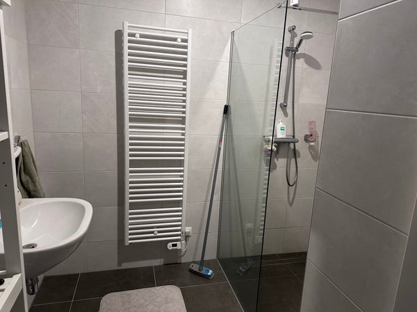 • Salle de bain (partiellement) carrelée avec douche à l'italienne avec paroi en verre fixe, lavabo et radiateur ;