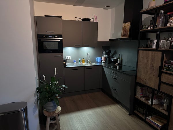 • Salon avec cuisine ouverte équipée d’un réfrigérateur (sans compartiment congélateur), d’un micro-ondes combiné, d’un plaque de cuisson à induction avec 4 zones de cuisson, hotte aspirante à recyclage, et lave-vaisselle ;
