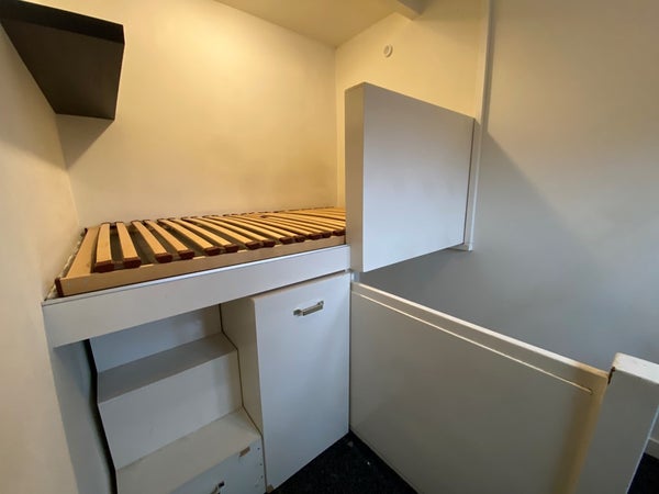 L'appartement est situé au premier étage de l'immeuble et a une superficie d'environ 20 m². Vous entrez dans le salon avec cuisine ouverte, qui est équipée d'une hotte, d'une plaque de cuisson à induction, d'un four, d'un réfrigérateur et d'un lave-vaisselle. La salle de bain dispose d'une douche, de toilettes et d'un lavabo. De plus, le studio dispose d'un balcon et d'une pièce séparée au-dessus.