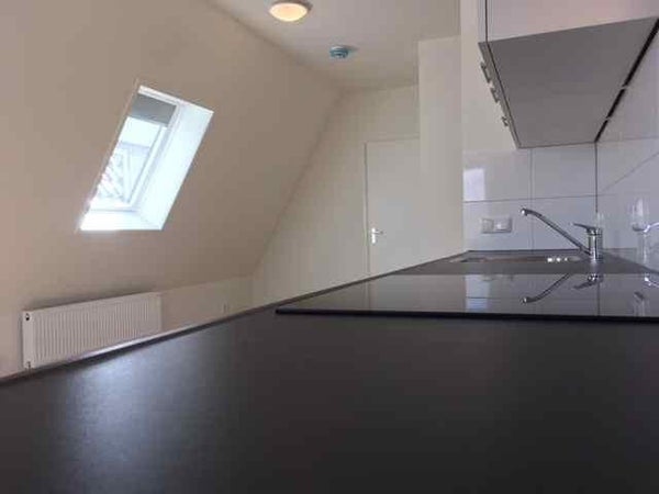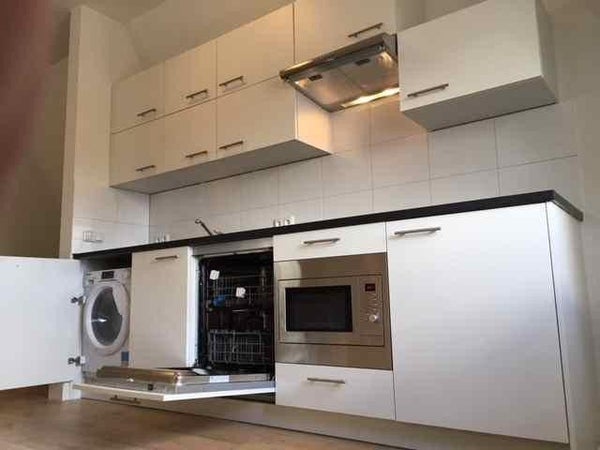 La cuisine est équipée de divers appareils encastrés, y compris un réfrigérateur, une plaque de cuisson, une hotte aspirante, un lave-linge, et un four micro-ondes combiné. L'appartement dispose de sa propre salle de bain avec douche, toilettes et meuble lavabo. De plus, il a une chambre séparée. L'appartement est chauffé par le chauffage central et dispose d'un sol en stratifié.