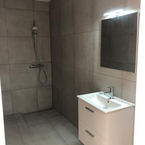 La salle de bain dispose d'une douche, d'un lavabo et d'un miroir. Les toilettes sont séparées, offrant un confort supplémentaire.