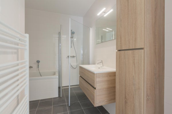 La salle de bain est moderne et complète, avec une douche fermée, une baignoire, un toilette, un lavabo avec meuble, un radiateur pour serviettes et un espace de rangement supplémentaire. De plus, il y a des toilettes séparées dans le couloir.