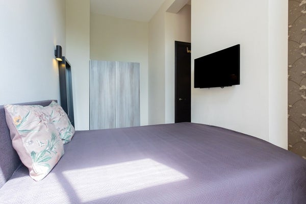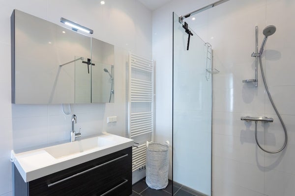 Le logement comprend une chambre, une salle de bain spacieuse équipée d'une douche à l'italienne, d'un toilette et d'un lavabo.
