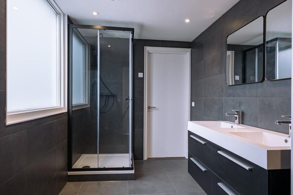 • grande salle de bain de luxe avec douche à l'italienne, double lavabo et connexion pour machine à laver