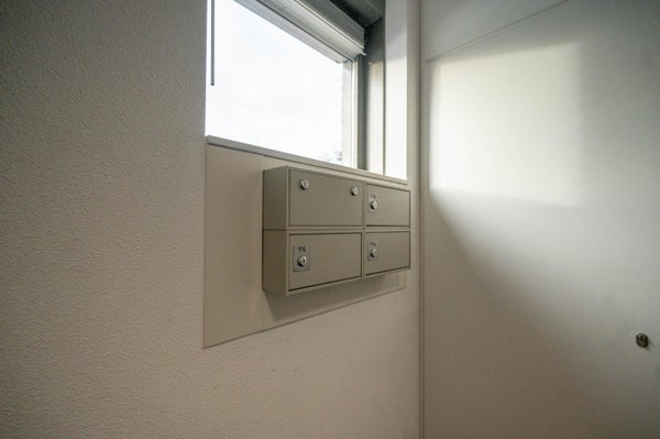 Entrée commune fermée et hall central avec boîtes aux lettres. L'appartement est situé au rez-de-chaussée.