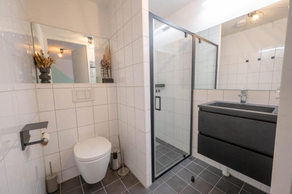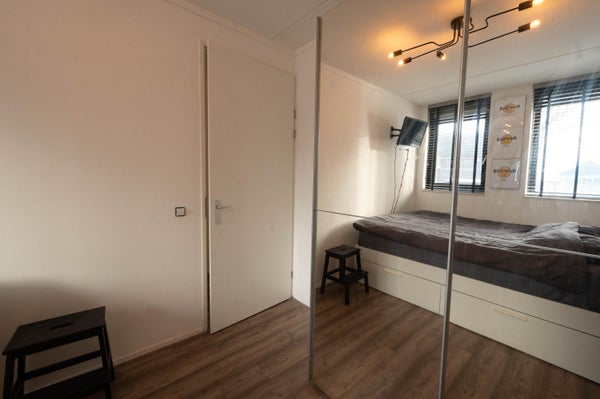 À travers le hall, vous entrez directement dans le salon avec cuisine ouverte, équipée d'une cuisinière à gaz avec hotte, d'un réfrigérateur-congélateur et d'un micro-ondes combiné. Dans le salon, il y a un canapé, une table à manger et une télévision. Depuis le salon, vous profitez d'une belle vue sur l'eau et pouvez vous asseoir à l'extérieur pendant les mois d'été. La chambre est meublée d'un lit double et d'une armoire PAX. La salle de bain est équipée d'une douche à l'italienne, d'un toilette, d'un lavabo avec meuble et de miroirs.