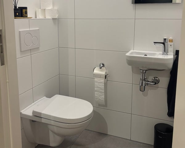 - Toilettes (partiellement) carrelées, équipées d'un toilette suspendu et d'un lavabo ;