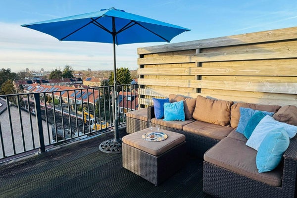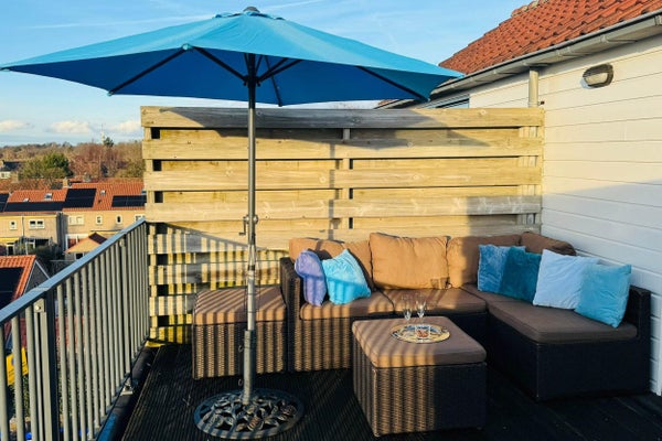 Appartement 5 pièces entièrement autonome et meublé (env. 120 m²) réparti sur trois niveaux, avec terrasse sur le toit ensoleillée.
