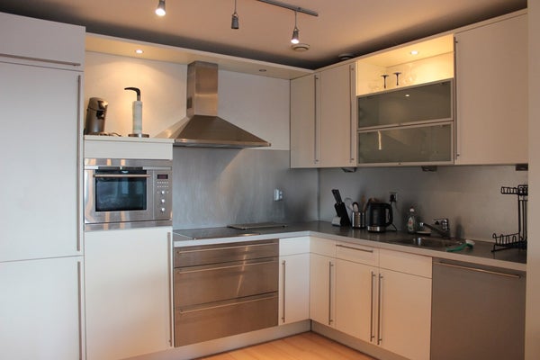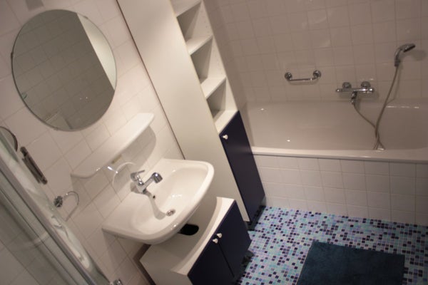 Le spacieux salon lumineux a une superficie d'environ 36m2. La cuisine est ouverte et équipée de tous les appareils modernes tels qu'un lave-vaisselle, un réfrigérateur/congélateur, un four combiné et une plaque de cuisson à induction. L'appartement dispose de 2 chambres : 1ère chambre d'environ 14m2, 2ème chambre d'environ 10m2. La salle de bain (environ 8m2) est équipée d'une baignoire et d'une cabine de douche. Toilettes séparées dans le couloir. Terrasse ensoleillée de 6m2!