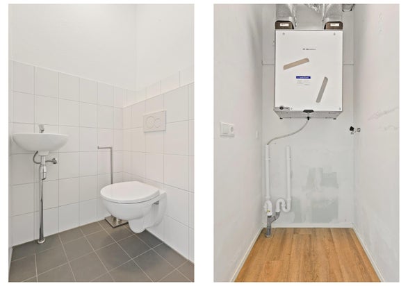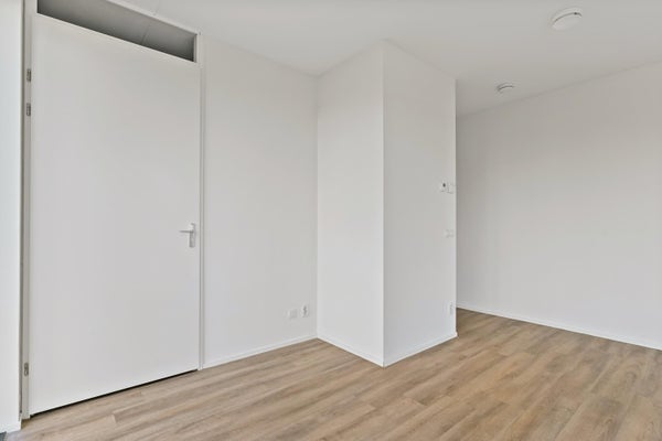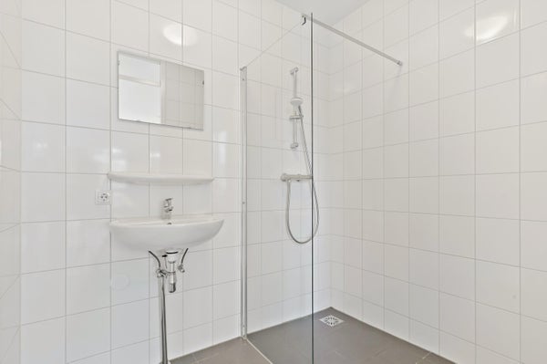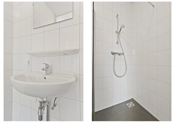 La salle de bain est située séparément et équipée d'une douche et d'un lavabo. Grâce à l'agencement astucieux et une hauteur sous plafond d'environ 2,6 mètres, l'espace disponible est utilisé de manière optimale. Ce studio est aménagé de manière pratique et confortable et convient à un ménage d'une seule personne dans un emplacement central à Leiden.