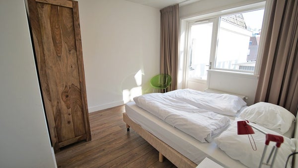 Au bout du couloir se trouve la chambre, qui, comme la cuisine, donne accès à la terrasse commune sur le toit. Celle-ci est située à l'arrière du bâtiment, où vous pourrez profiter du trafic de navigation agréable des canaux de Leidse par beau temps.