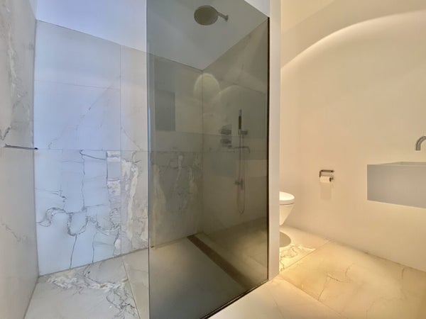 Salle de bain design entièrement construite avec du marbre blanc, chauffage au sol, lavabo, toilettes et douche à l'italienne.