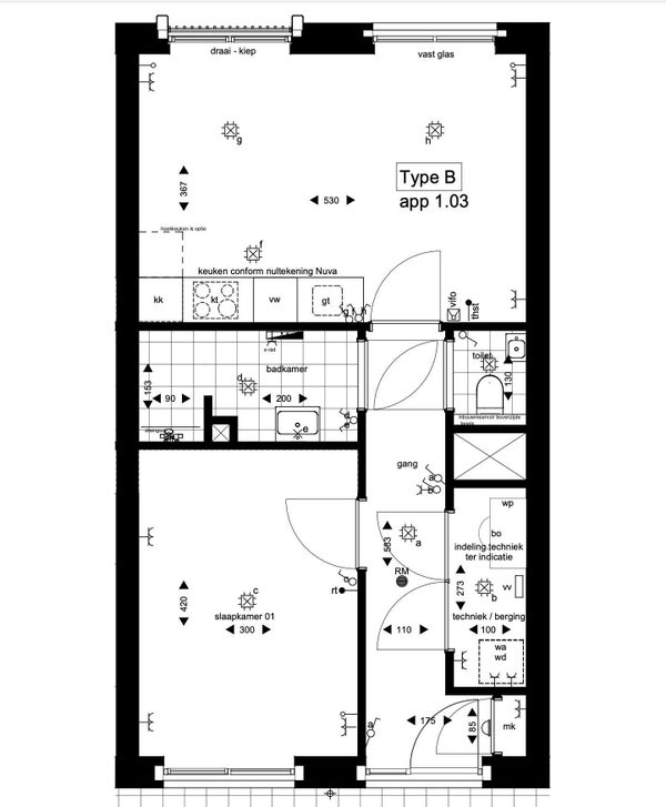 Entrée d'environ 6,5 m², salon d'environ 20 m² avec balcon français orienté au sud-est. Cuisine ouverte équipée d'un évier, d'une plaque de cuisson à induction 4 feux et d'une hotte. Chambre d'environ 12,6 m², salle de bain d'environ 3 m² avec meuble lavabo et douche à l'italienne. Toilettes séparées et local technique avec raccordement pour appareils électroménagers.