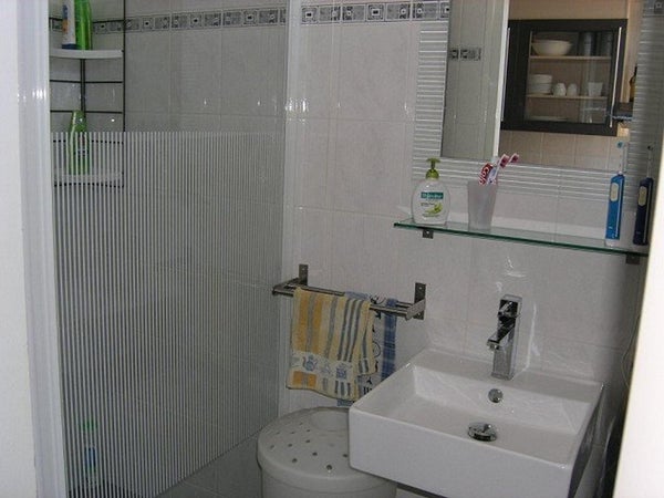 Salle de bains entièrement carrelée avec cabine de douche, lavabo, miroir et raccordement pour machine à laver.