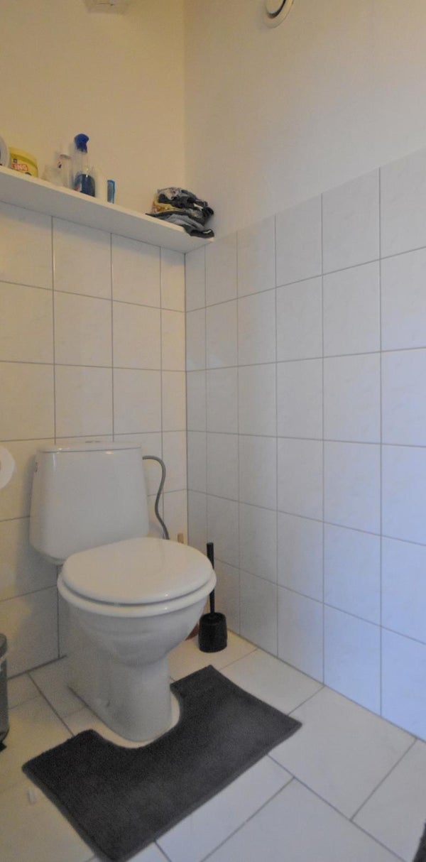 La salle de bains soignée dispose d'une douche, d'un lavabo et de toilettes.