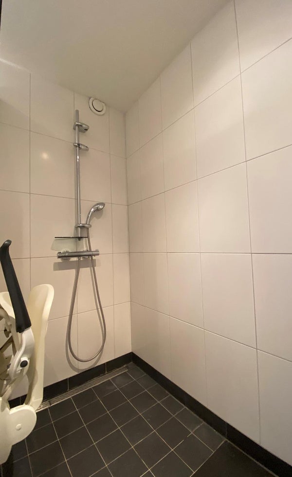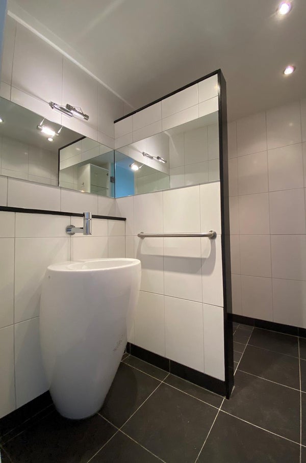 La salle de bains moderne dispose d'une douche à l'italienne et d'un lavabo fixe, tandis que les toilettes séparées sont équipées d'un lave-mains. Tous les sanitaires sont élégamment conçus dans un design italien de la marque Alessi.