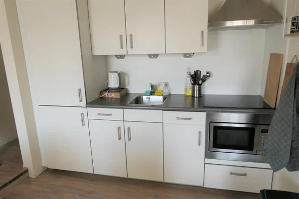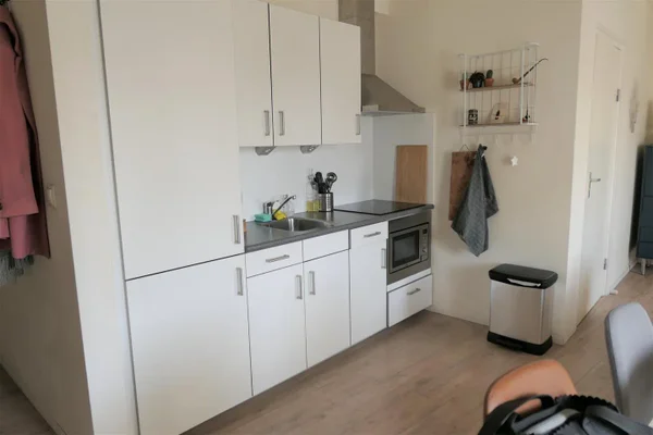 Bel appartement situé au deuxième étage d'un bâtiment monumental. L'appartement se compose d'un salon avec une cuisine ouverte, d'une salle de bain avec douche, lavabo et toilettes, et d'une chambre à l'étage de combles. Il y a également un espace extérieur commun et un local à vélos disponibles.